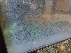 滝から跳ねた水がガラスにつき、それが乾いてカルシウム成分が残って